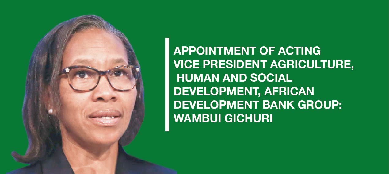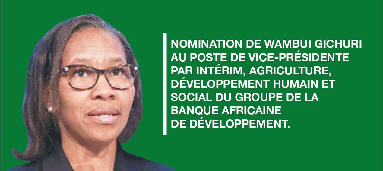 Le Groupe de la Banque africaine de développement (www.AfDB.org) a le plaisir d'annoncer la nomination de Wambui Gichuri au poste de Vice-présidente par intérim, Agriculture, développement humain et social, à compter du 5 juillet 2020.
