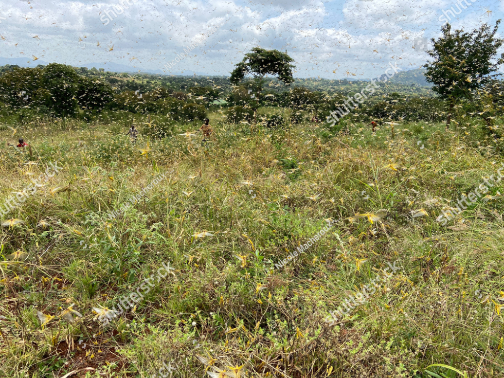 - 2020-02-14 Kiaruni/Kenya Swarm of 40-50 million adult desert locust hits millet fields in dmall Kenyan village - By Nicole Macheroux-Denault