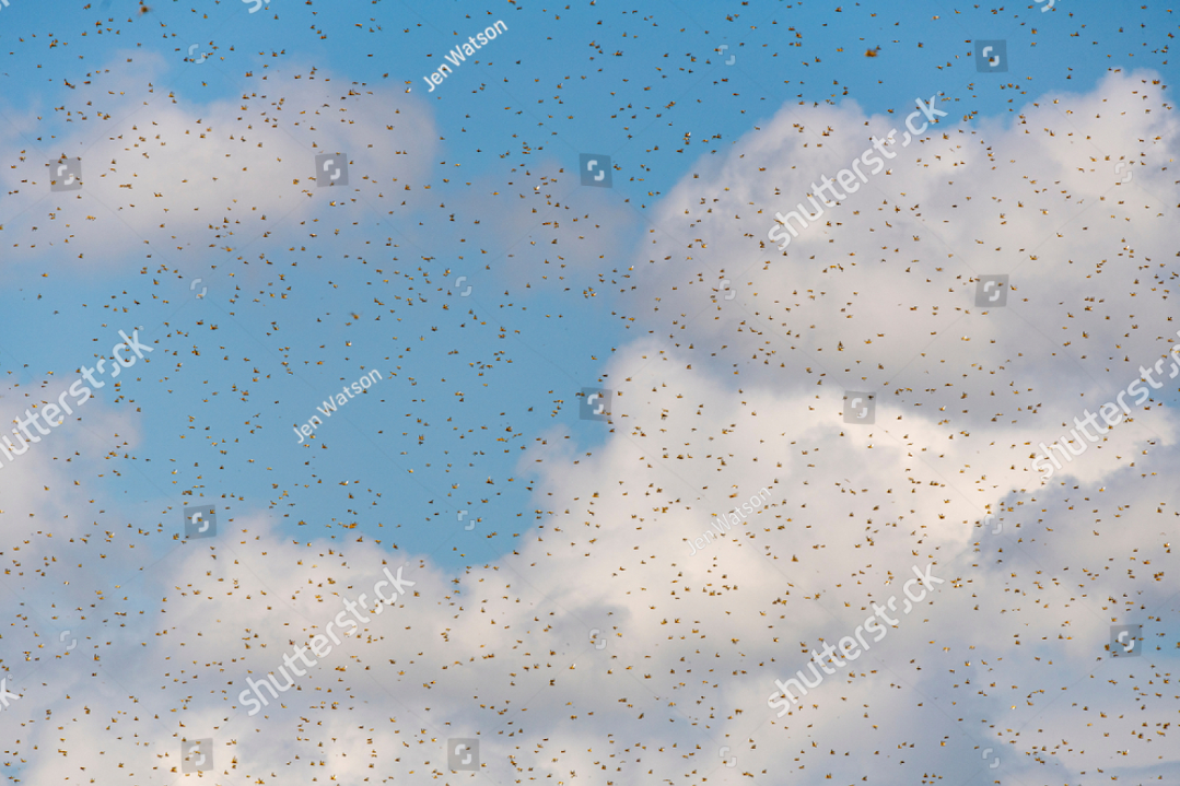 - Swarm of destructive Desert Locusts fill the sky over Samburu NR, Kenya. Locusts appear as dots in front of White clouds and blue sky. Schistocerca gregaria - By Jen Watson
