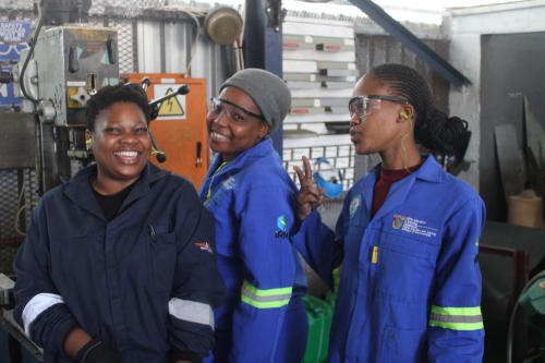 - Three young women participate in a National Business Initiative skills training program, gaining practical trade skills to support South Africa's economy