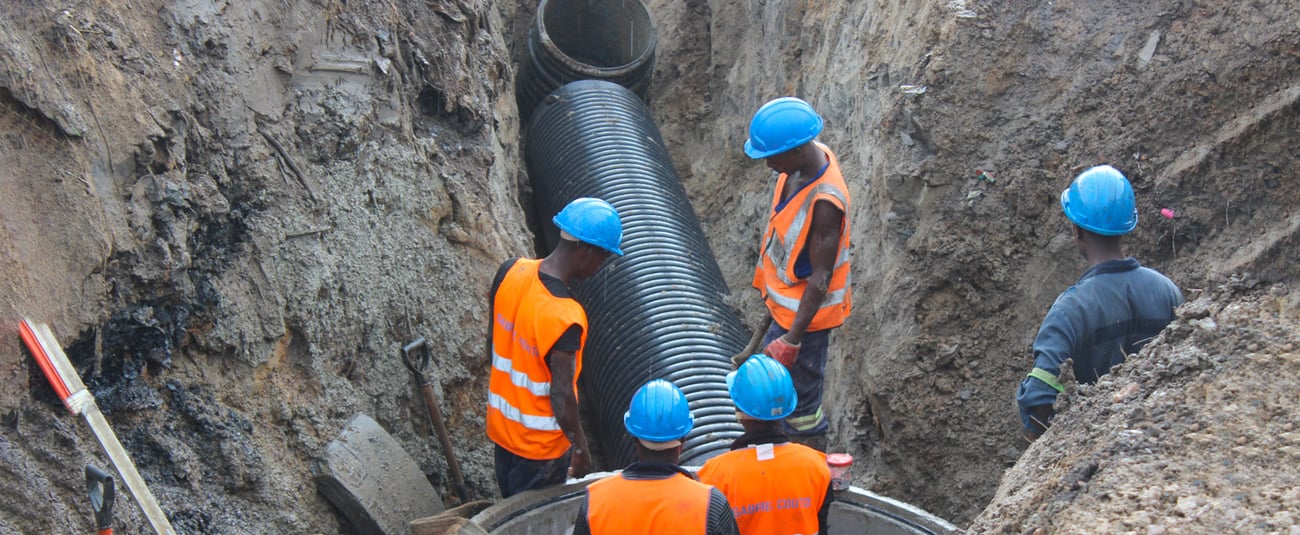 - Workers laying heavy pipes at the Lusaka Sanitation Project—one of the many projects supported by AfDB in Zambia