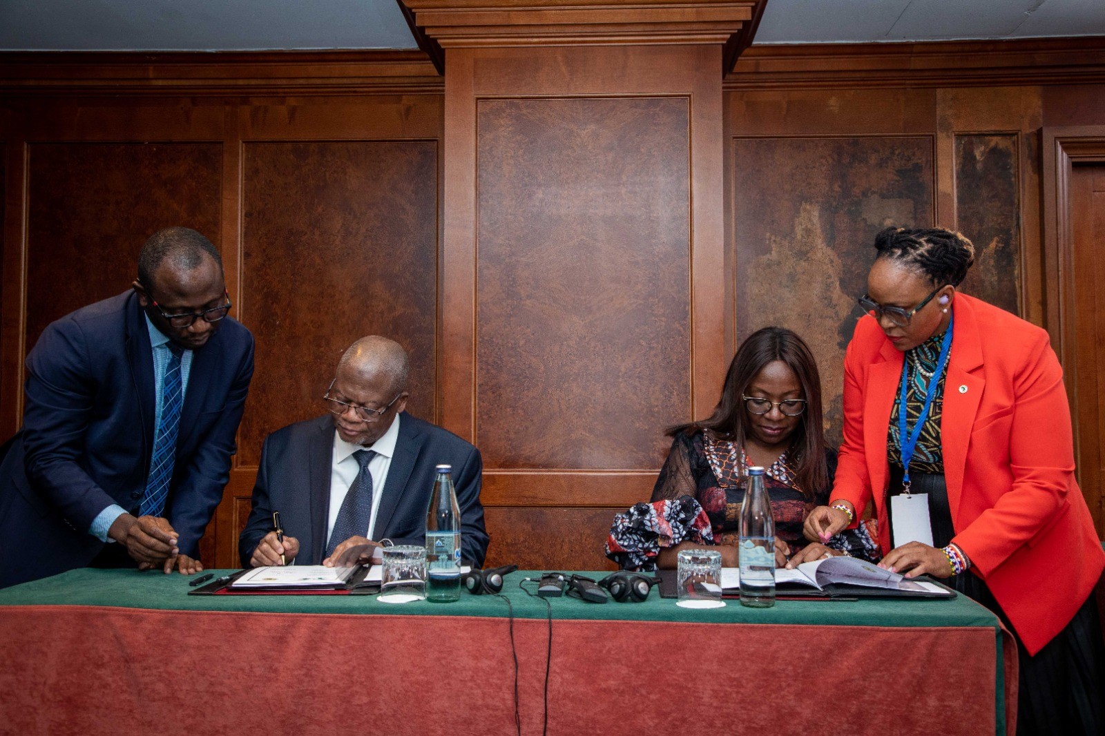 - Ambassador Mamman Nuhu, Executive Secretary of the Lake Chad Basin Commission (seated, left) and African Development Bank VP for Regional Development, Integration and Business Delivery, Marie-Laure Akin-Olugbade (seated, right) sign MOU framework to restore the Lake Chad Basin
