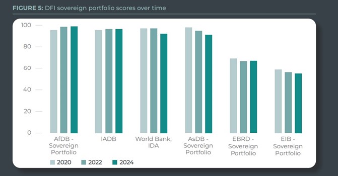 L’Indice 2024 évalue six portefeuilles souverains (du secteur public) et six portefeuilles non souverains (du secteur privé) d’institutions de financement du développement (IFD). Les portefeuilles souverains d’institutions de financement du développement occupent trois des cinq premières places du classement, la Banque africaine de développement arrivant en tête, suivie par la Banque interaméricaine de développement à la deuxième place et l’Association internationale pour le développement de la Banque mondiale à la quatrième place.