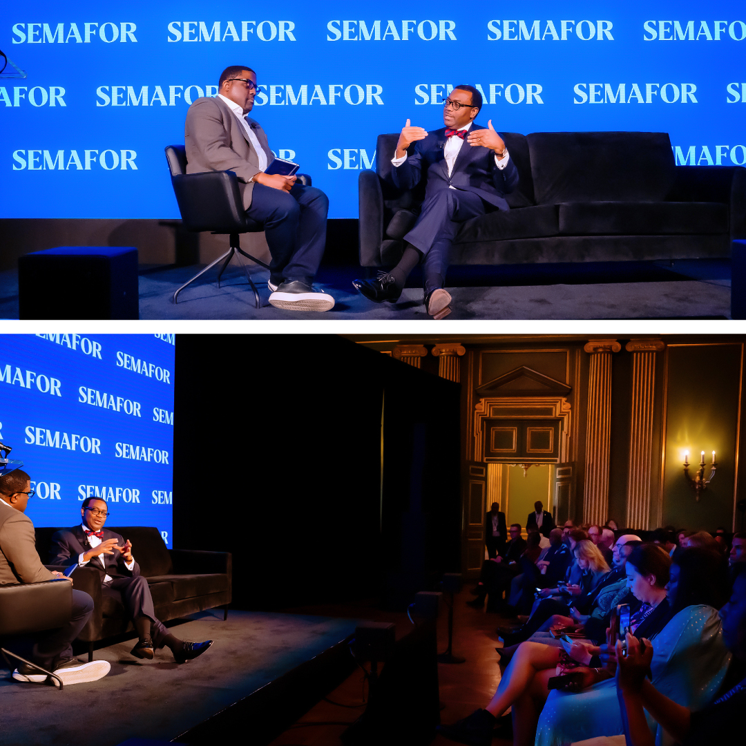 - O Dr. Akinwumi Adesina (à direita) alerta para o impacto dos empréstimos não transparentes garantidos por recursos no peso da dívida de África. Cúpula Semafor, Washington DC abril de 2024 (1)