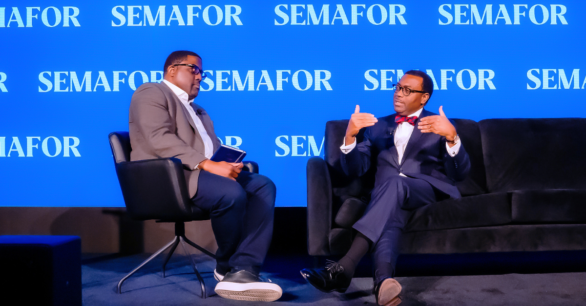 - O Dr. Akinwumi Adesina (à direita) alerta para o impacto dos empréstimos não transparentes garantidos por recursos no peso da dívida de África. Cúpula Semafor, Washington DC abril de 2024 (2)