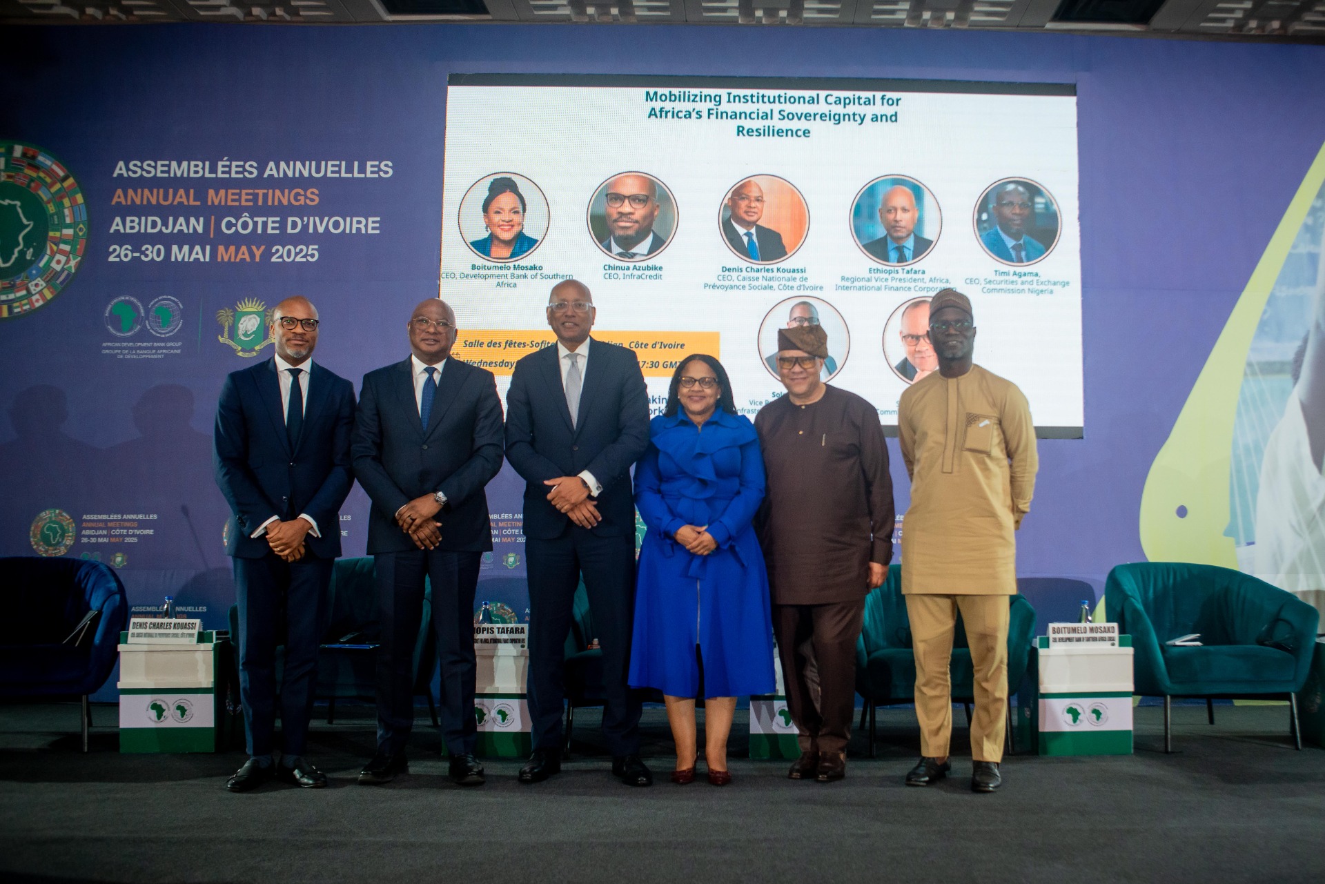 - Left to right: Chinua Azubike, CEO of InfraCredit; Denis Charles Kouassi, CEO of Côte d'Ivoire’s National Social Security Fund; Ethiopis Tafara, Vice President of the International Finance Corporation; Boitumelo Mosako, CEO of the Development Bank of Southern Africa (DBSA); session moderator Victor Oladokun, Senior Advisor to the President of the African Development Bank Group for Communication and Stakeholder Engagement; and Timi Agama, Director General of Nigeria’s Securities and Exchange Commission