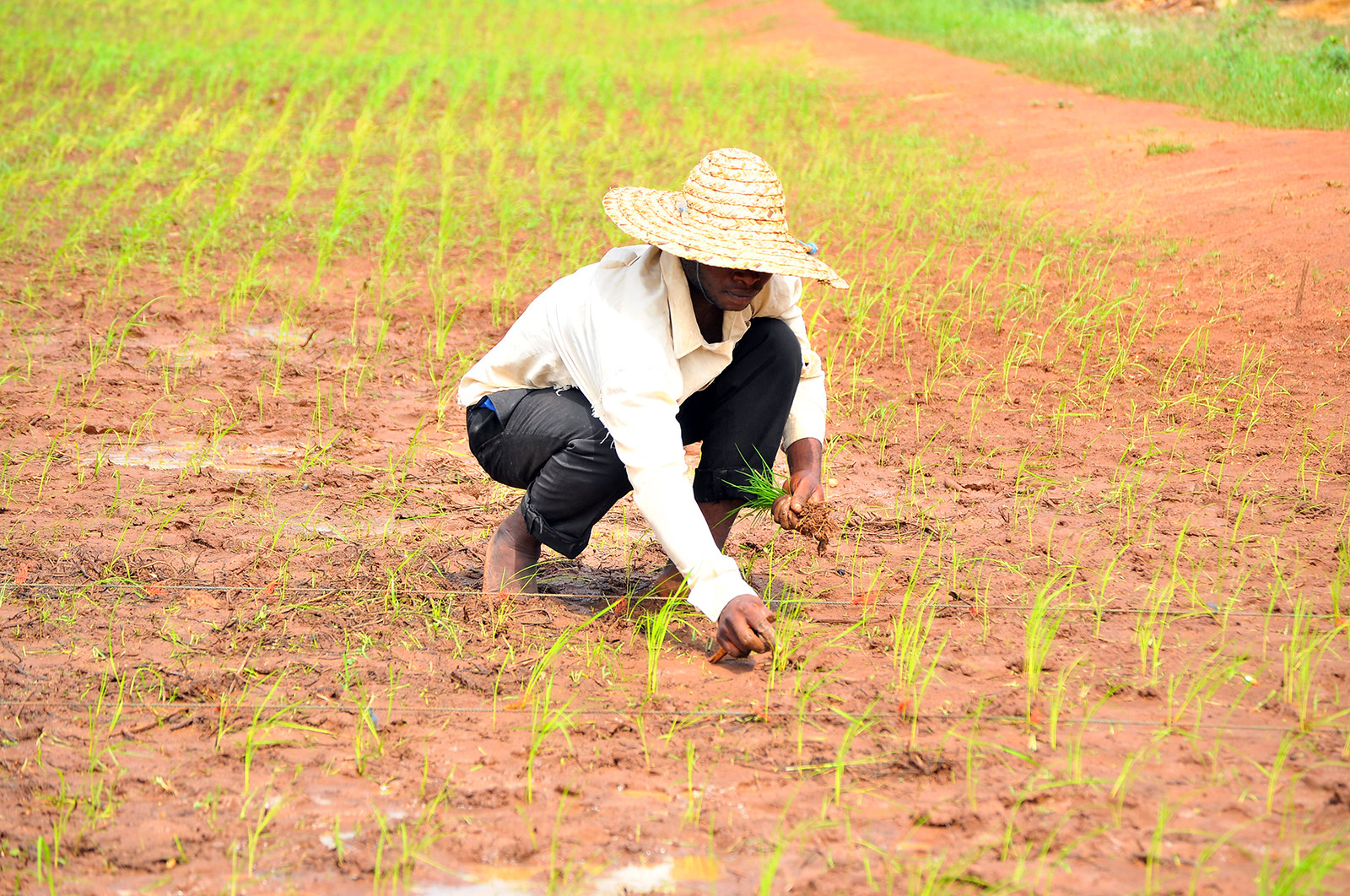 - Um agricultor beninês que transplanta arroz Nerica. A garantia parcial de crédito do Fundo Africano de Desenvolvimento permitirá ao Benim angariar fundos para investir em setores de desenvolvimento sustentável, tais como a agricultura