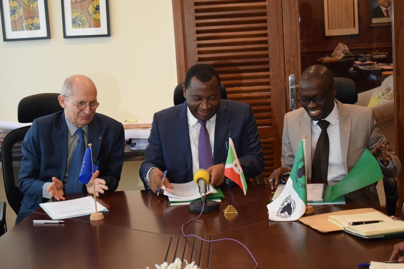 Les accords ont été paraphés par le ministre burundais des Finances, du budget et de la coopération au développement économique, Domitien Ndihokubwayo, et le responsable pays de la Banque Africaine de développement au Burundi, Daniel Ndoye, en présence de Claude Bochu, chef de la délégation de l’Union européenne (UE) au Burundi.