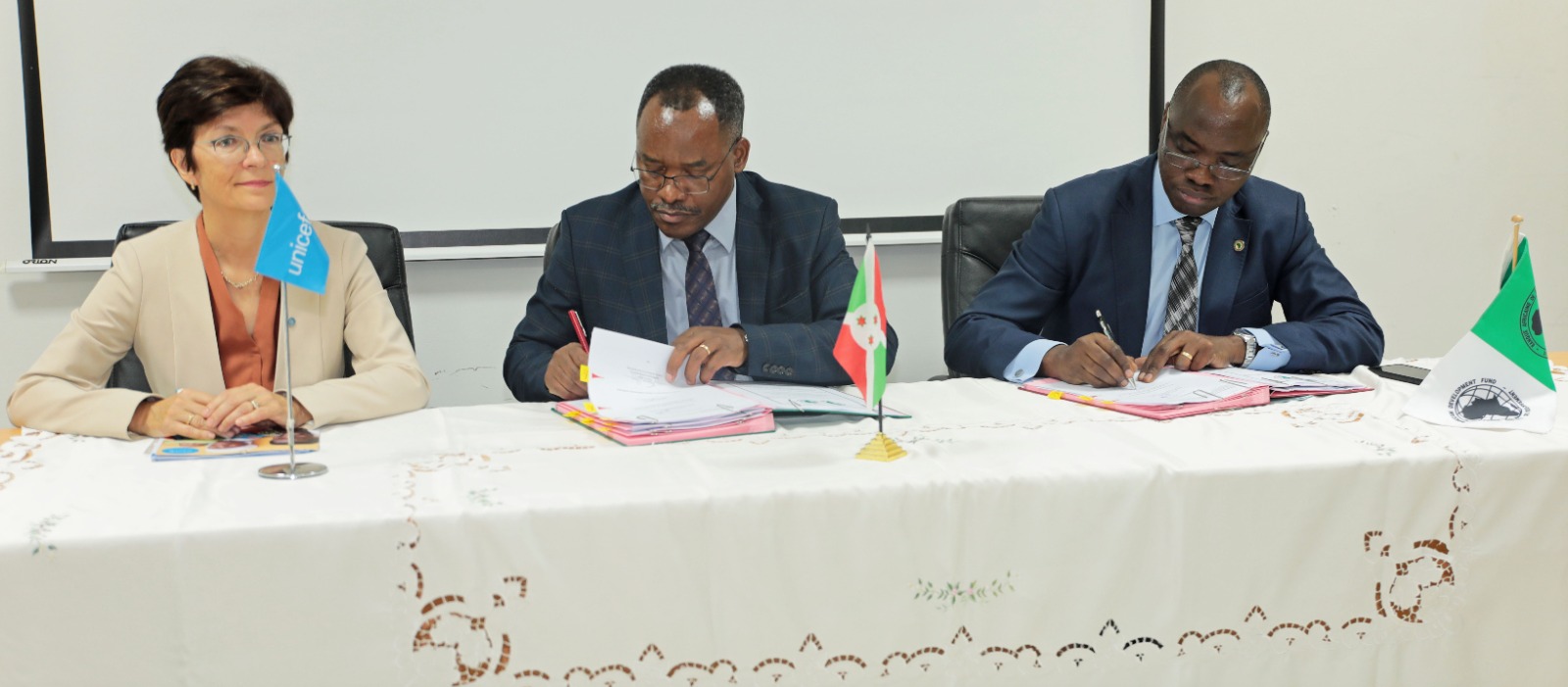 - Left to right: Ms France Bégin, Representative in Burundi of UNICEF, one of the implementing partners of the institutional support component of the project; Audace Niyonzima, Minister of Finance, Budget and Economic Planning of Burundi; and Pascal Yembiline, the Bank's Country Office Manager in Burundi, at the signing of the financing agreement on 21 November 2023 in Bujumbura
