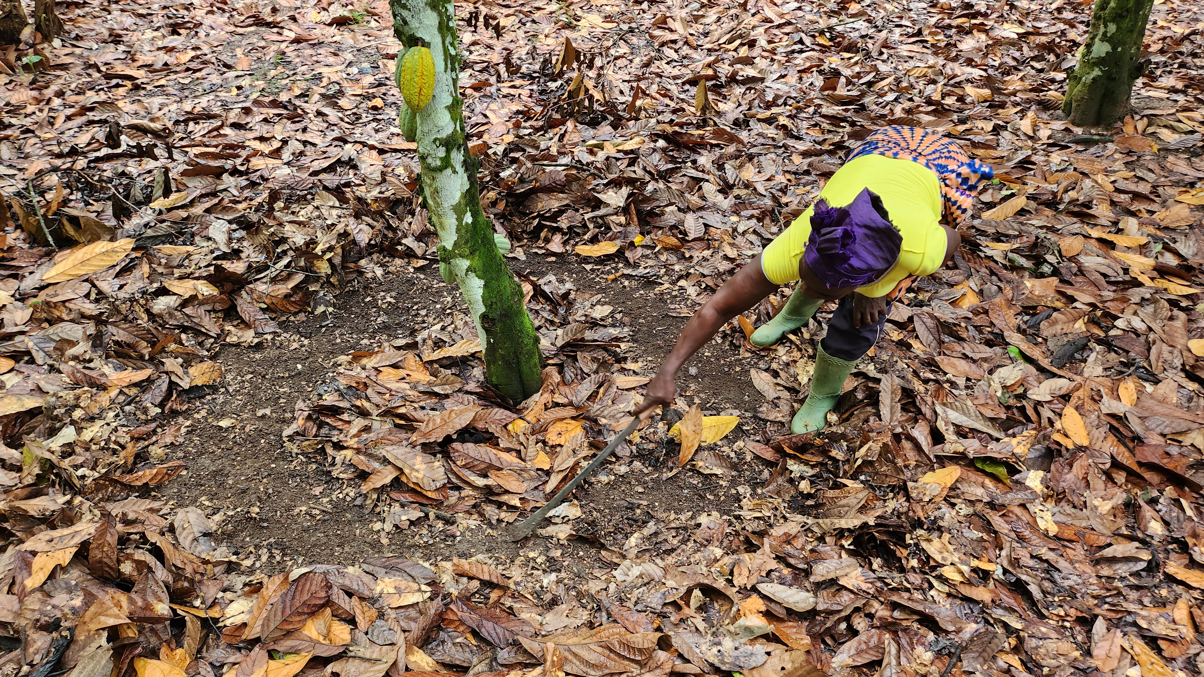 - Papo Delphine, une productrice de cacao, achève l'élagage des arbres avant la fertilisation