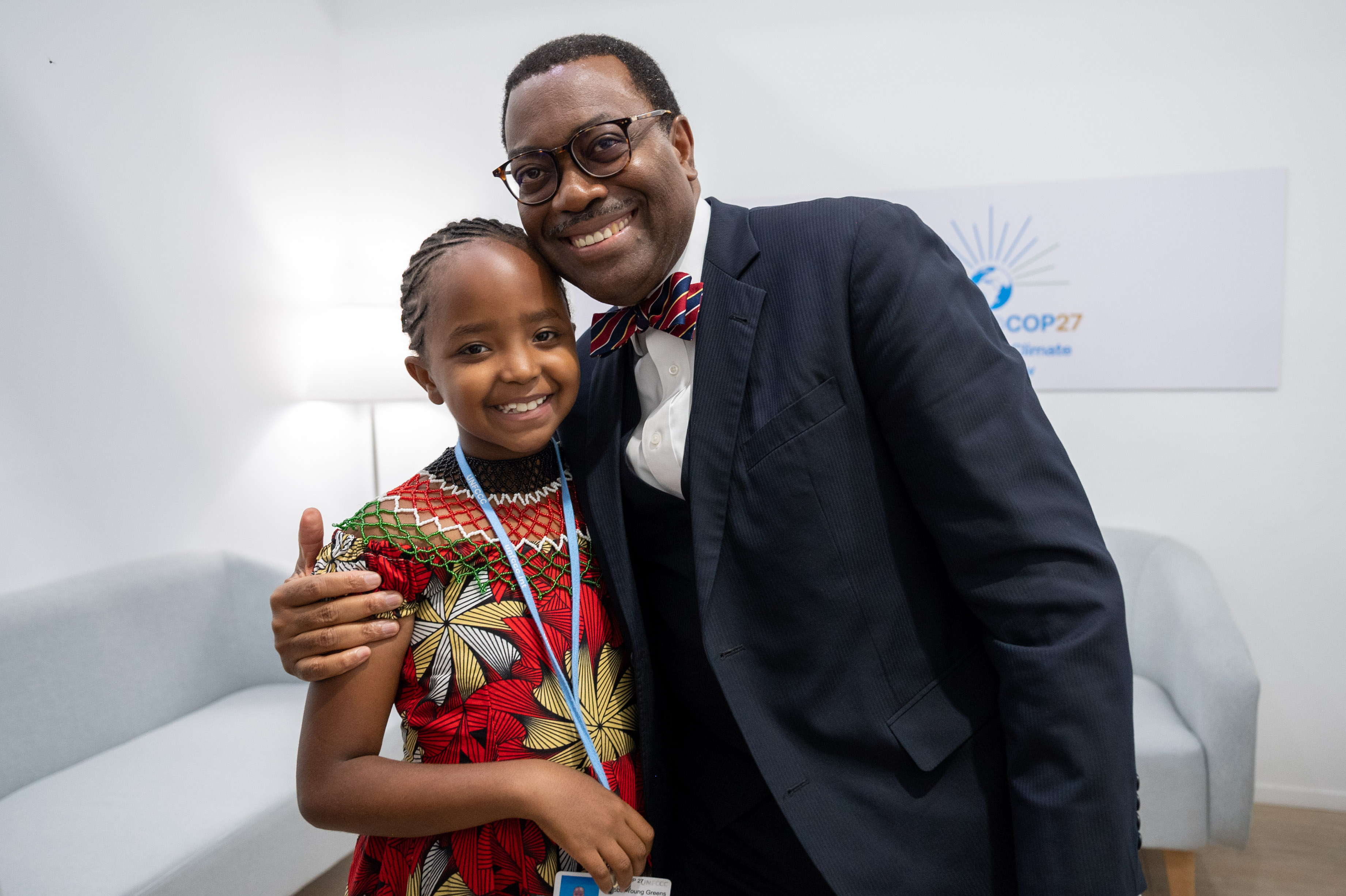 - O Presidente do Grupo Banco Africano de Desenvolvimento, Akinwumi Adesina, felicita a jovem Karen Kimani pela sua paixão pela proteção do ambiente, durante a COP27 no Egito, em novembro de 2022