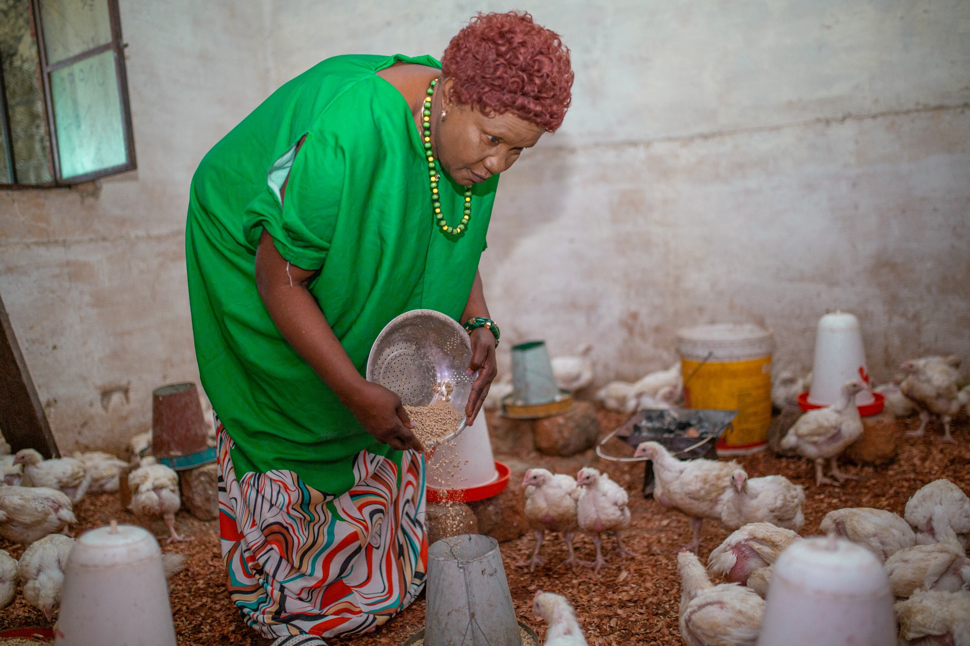 - Marie Samba, who left the artisanal mines, now raises hens and quails. Here she is preparing feed for her poultry