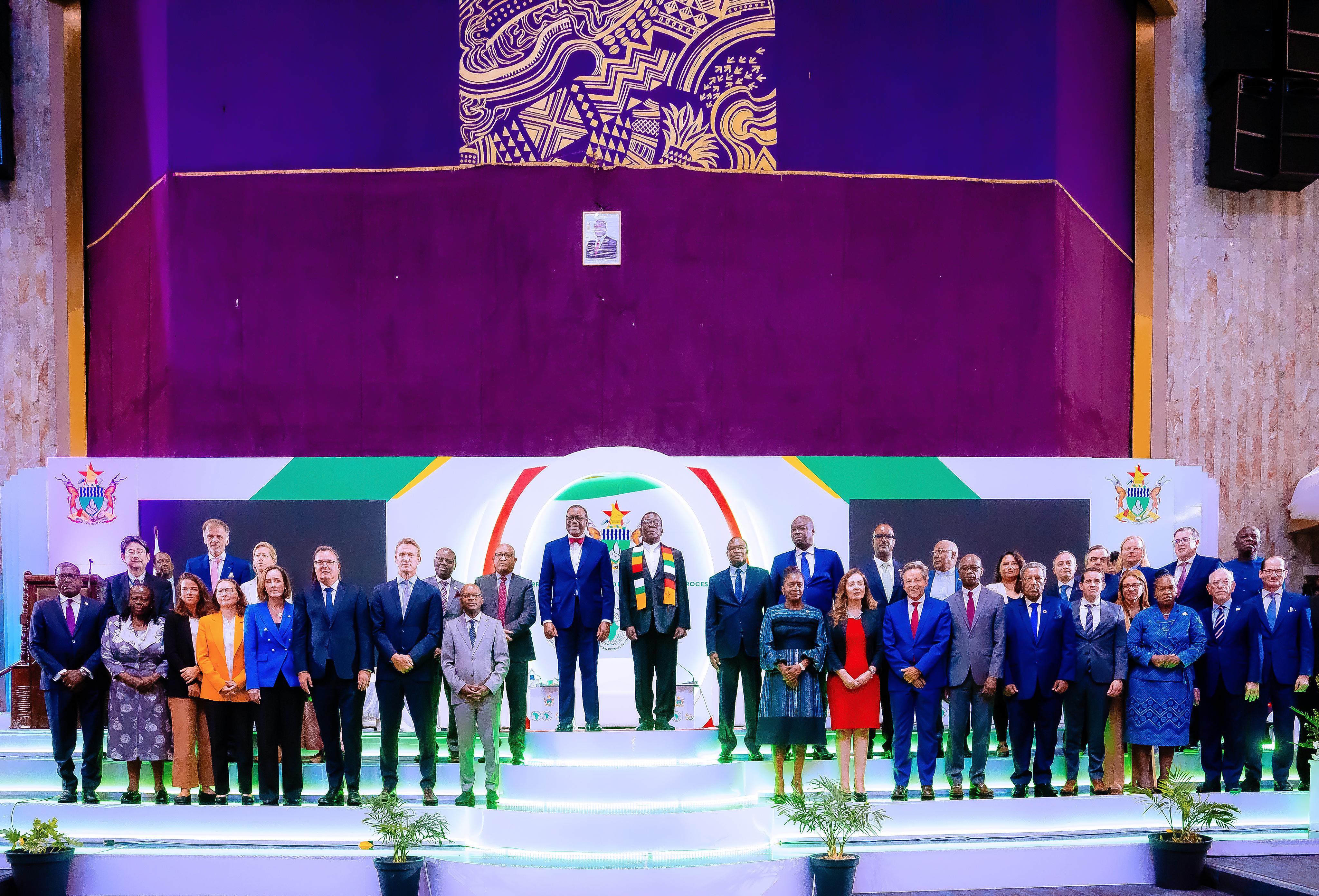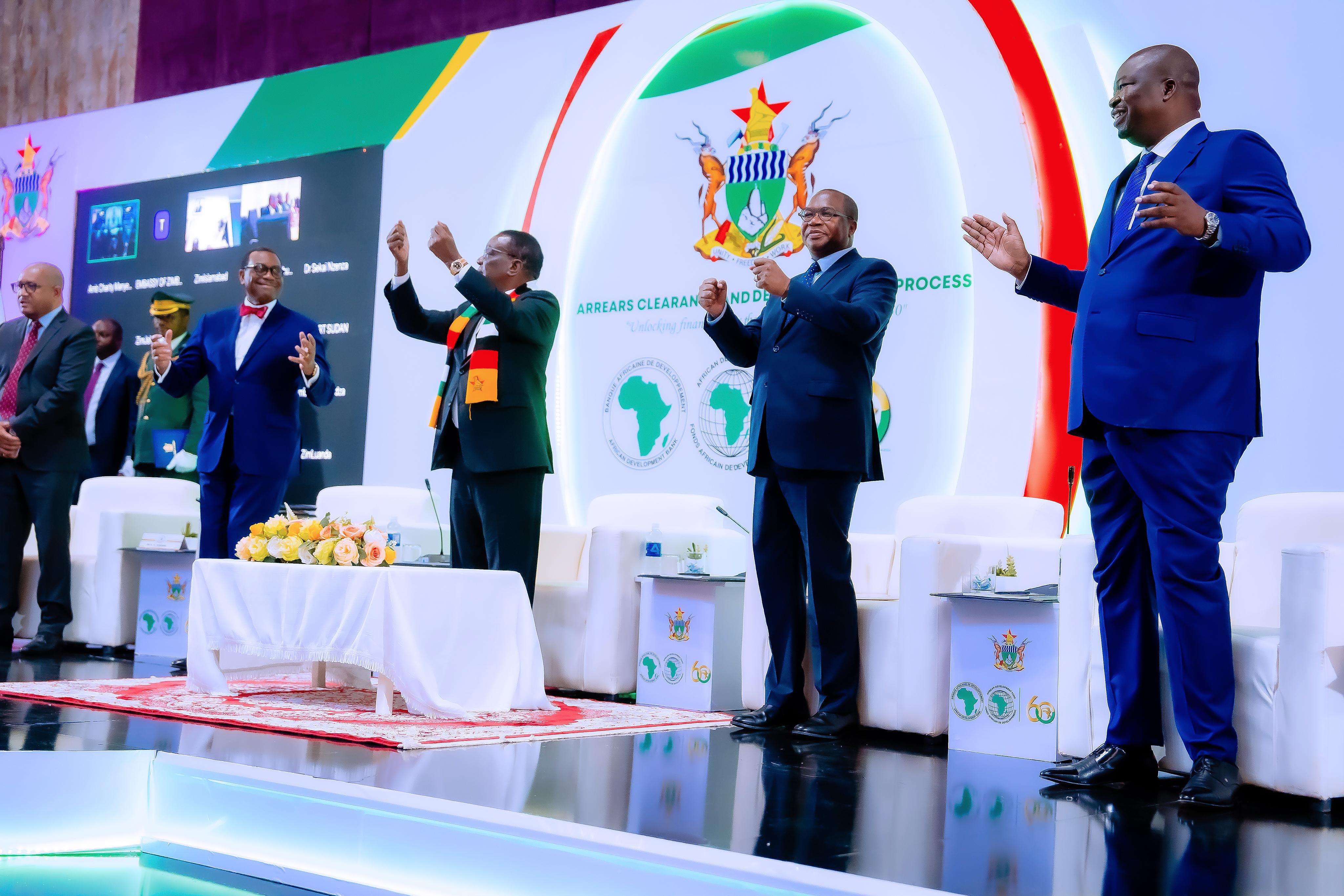 - Le président du Zimbabwe, Emmerson Mnangagwa, et le président du Groupe de la Banque africaine de développement, Akinwumi Adesina, sur une photo de groupe lors d’une réunion de la Plateforme de Dialogue structuré de haut niveau sur le processus d’apurement des arriérés et de restructuration de la dette du Zimbabwe, à laquelle ont participé des représentants des partenaires au développement et des pays créanciers le 25 novembre 2024 à Harare, au Zimbabwe