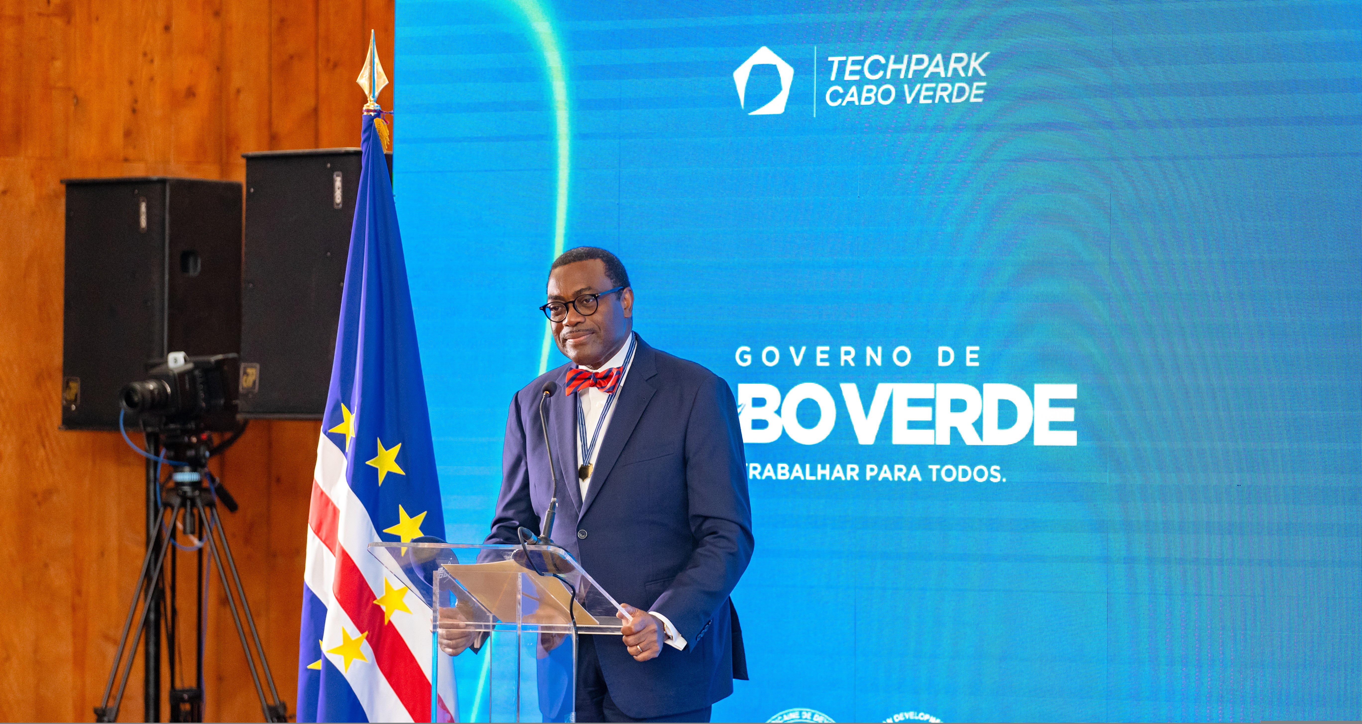 - Le président du Groupe de la Banque africaine de développement, Akinwumi Adesina, prononce un discours lors de la mise en service du Parc technologique de Praia, le 5 mai 2025