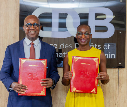 - روبرت ماسومبوكو، المدير القطري لمجموعة البنك الأفريقي للتنمية في بنن (يسار)، وماريز لوكوسو، العامة لصندوق الودائع والأمانات لبنن، اتفاق المنحة