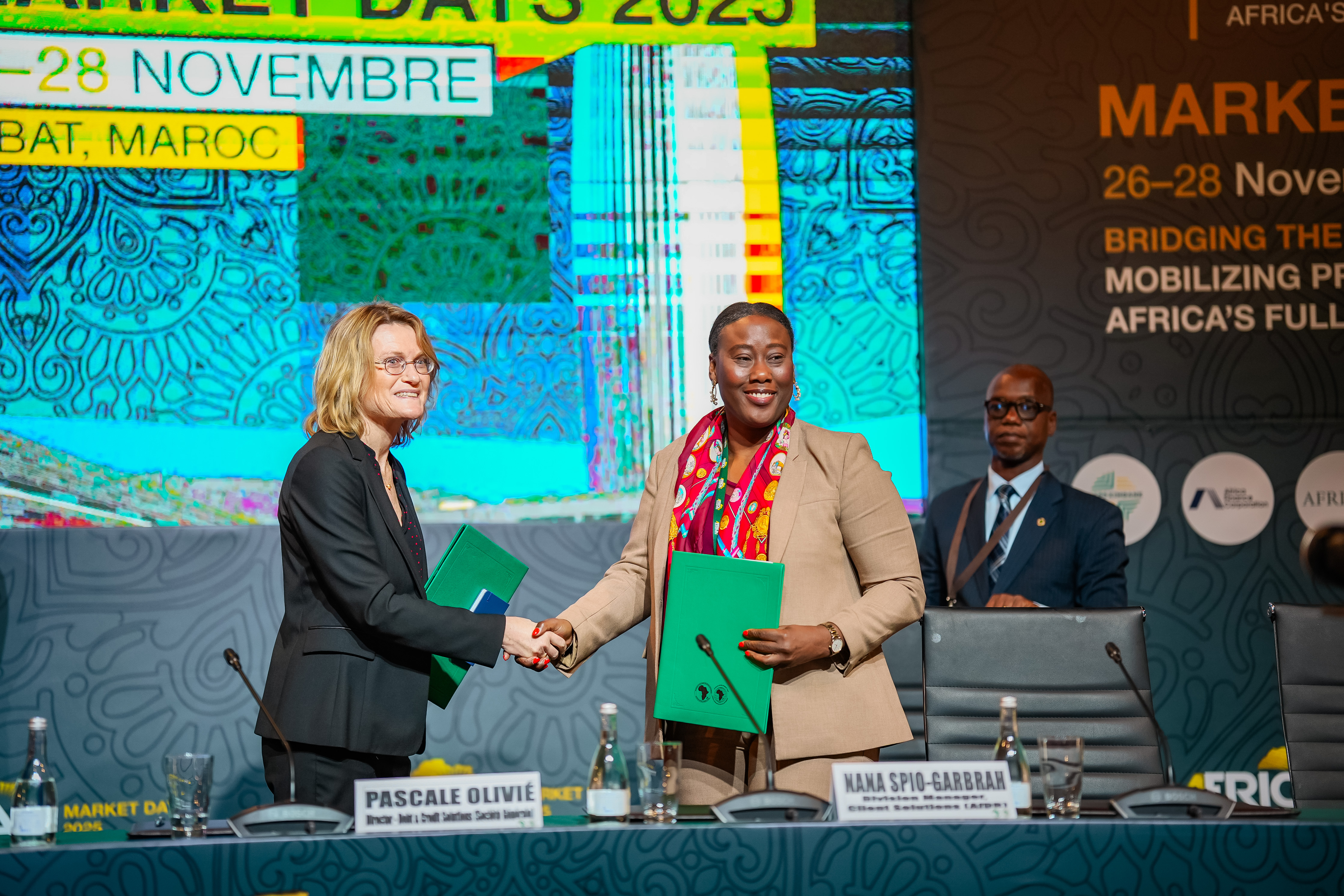 AfDB Division Manager Nana Spio-Garbrah (right) and Societe Generale (SG) Senior Advisor Pascale Olivié signed an agreement for SG to serve as lead advisor on the AfDB's Synthetic Securitization Platform