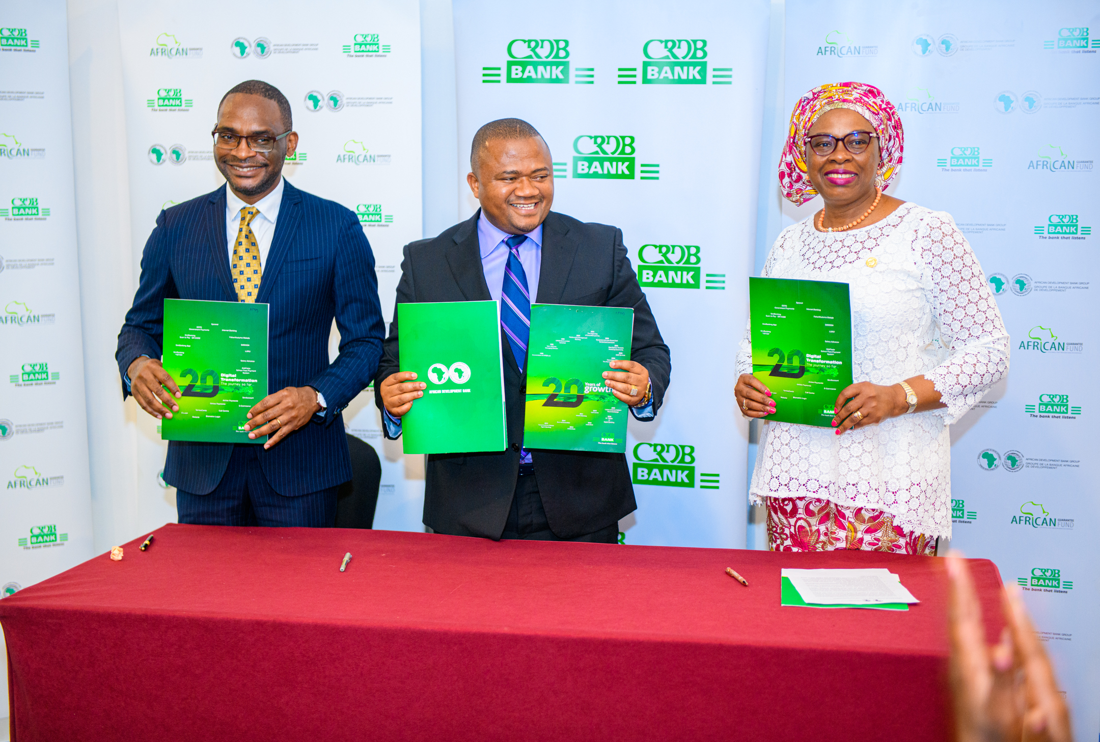 Jules Ngankam, CEO of AGF Group (left), Abdulmajid Nsekela, CEO of CRDB, and Nnenna Nwabufo, African Development Bank’s Director General for East Africa, holding copies of the signed agreements.