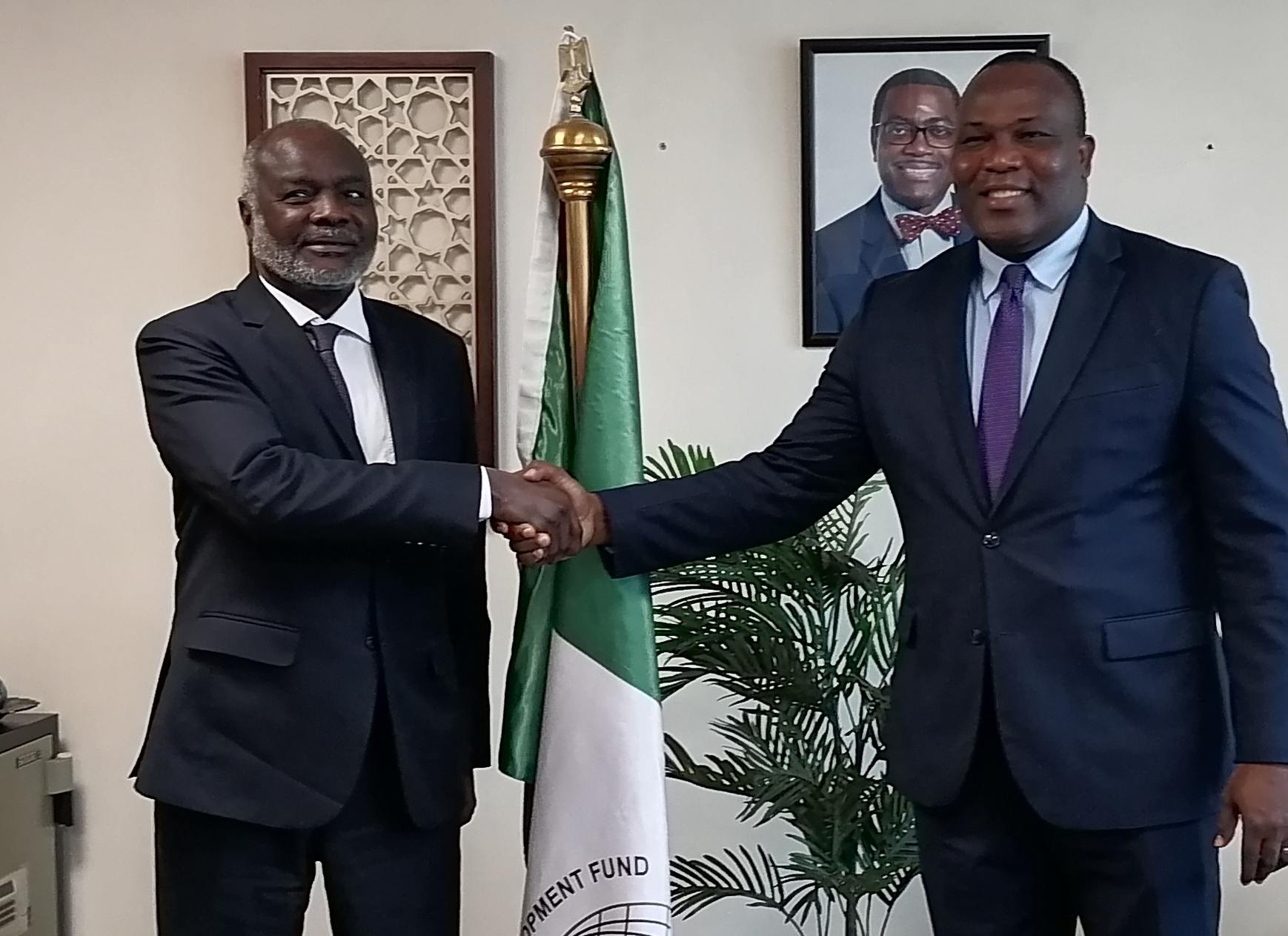 (L-R) Sudan’s Finance Minister and African Development Bank Governor, Dr. Gebreil Ibrahim Mohamed Fediel, warmly shakes hands with Rufus N. Darkortey, the Bank’s Executive Director for The Gambia, Ghana, Liberia, Sierra Leone, and Sudan