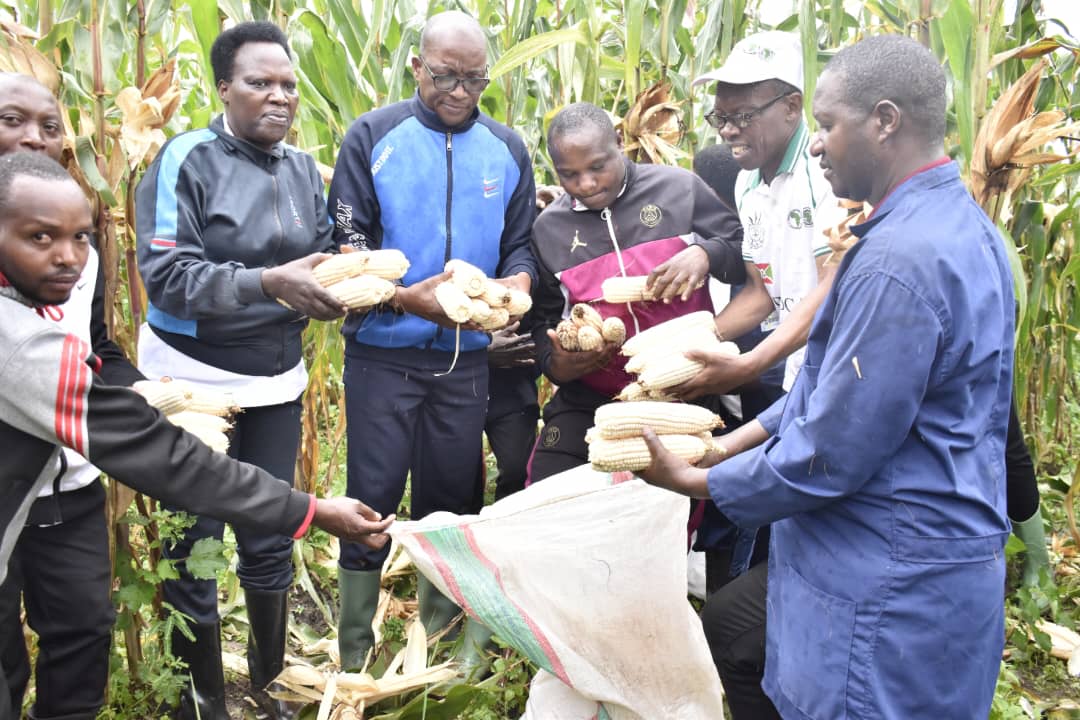 Beneficiaries and government and Bank officials help harvest maize produced by the Tsindinzara cooperative