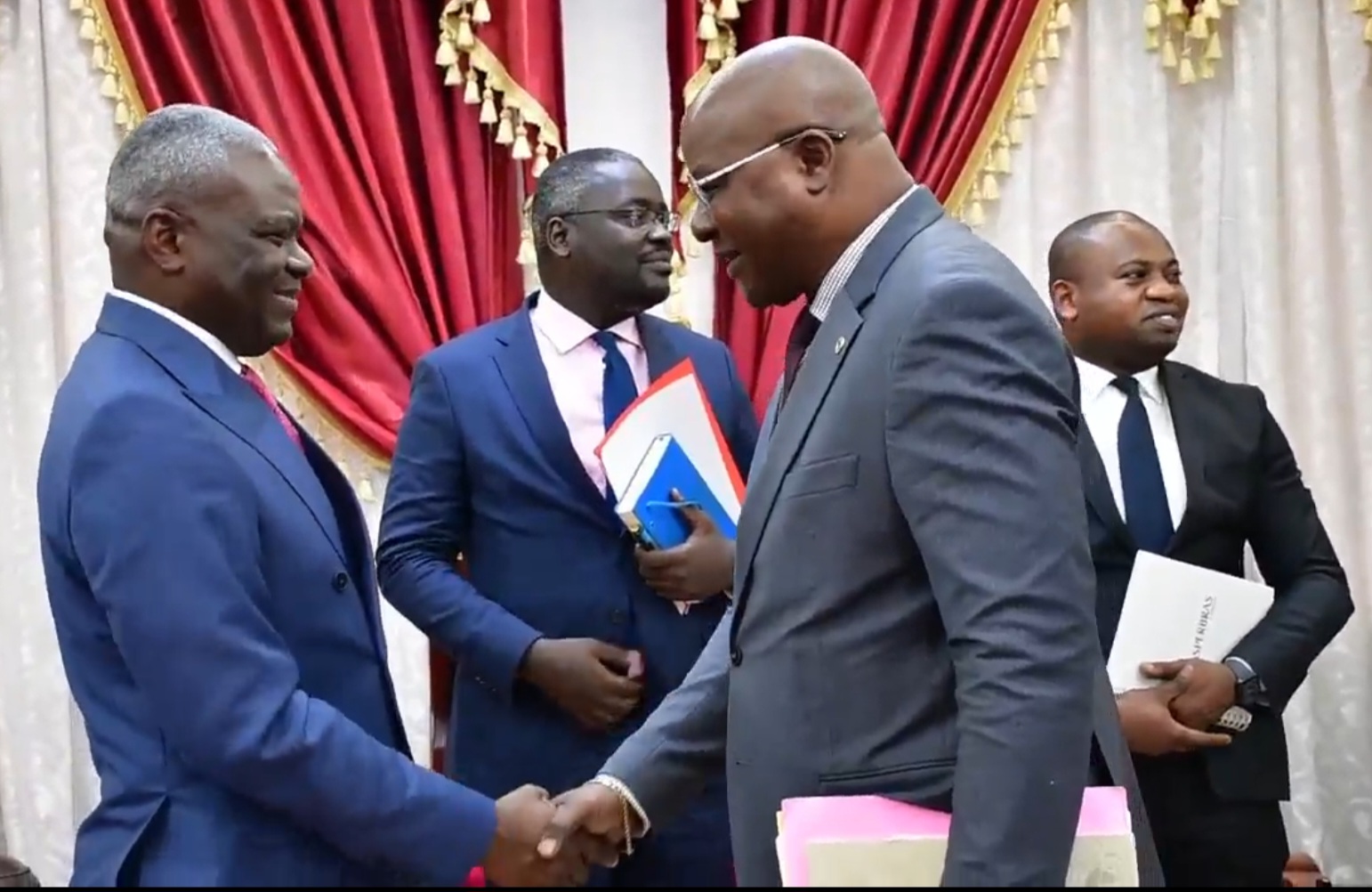 A handshake between the Prime Minister of the Republic of the Congo, Anatole Collinet Makosso, and the Bank’s acting Director General, Solomane Koné