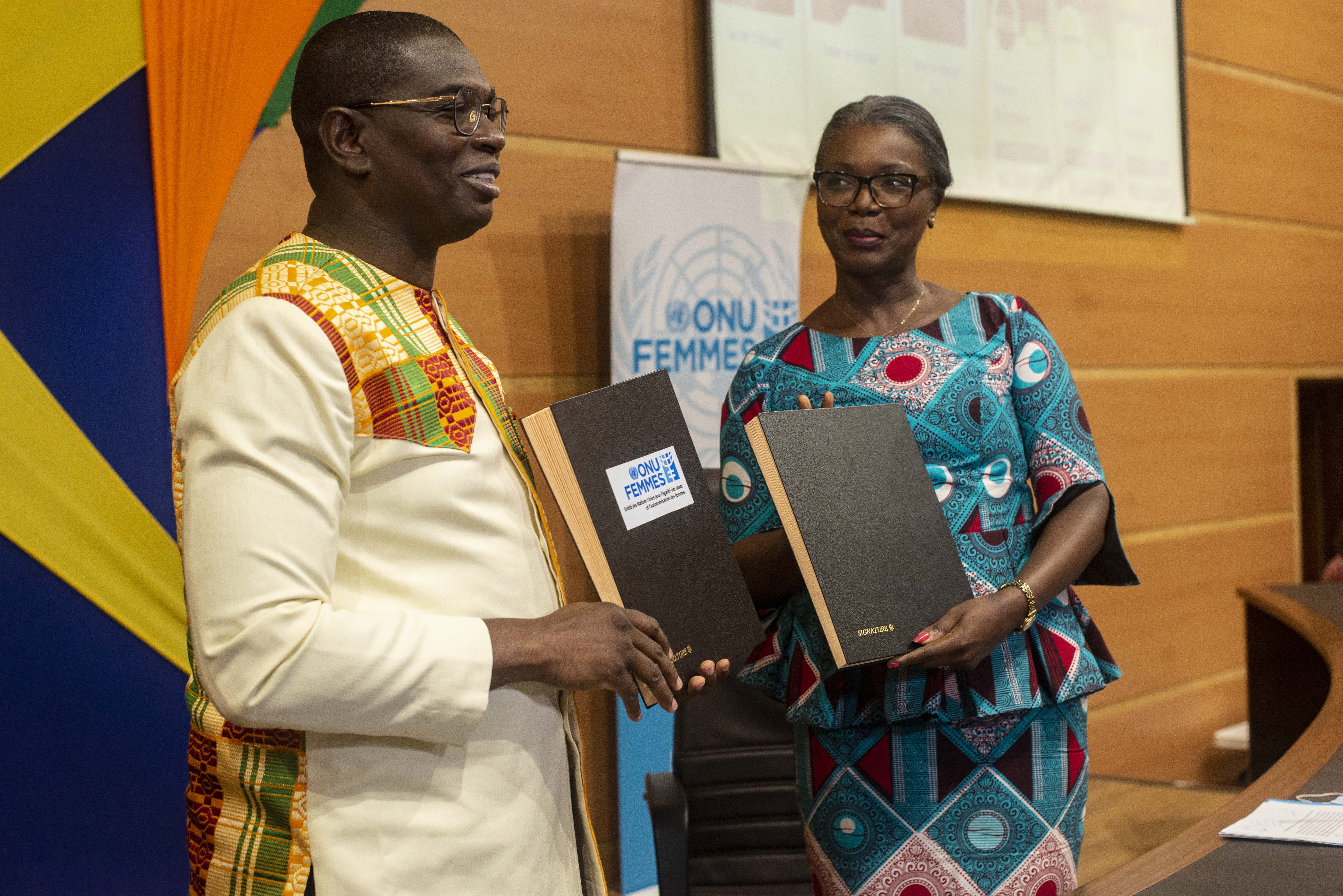 Minister Felix Anoblé (left) and UN Women’s Antonia Ngabala Sodonon signed an agreement for the management of the Blaatto platform during the launch ceremony