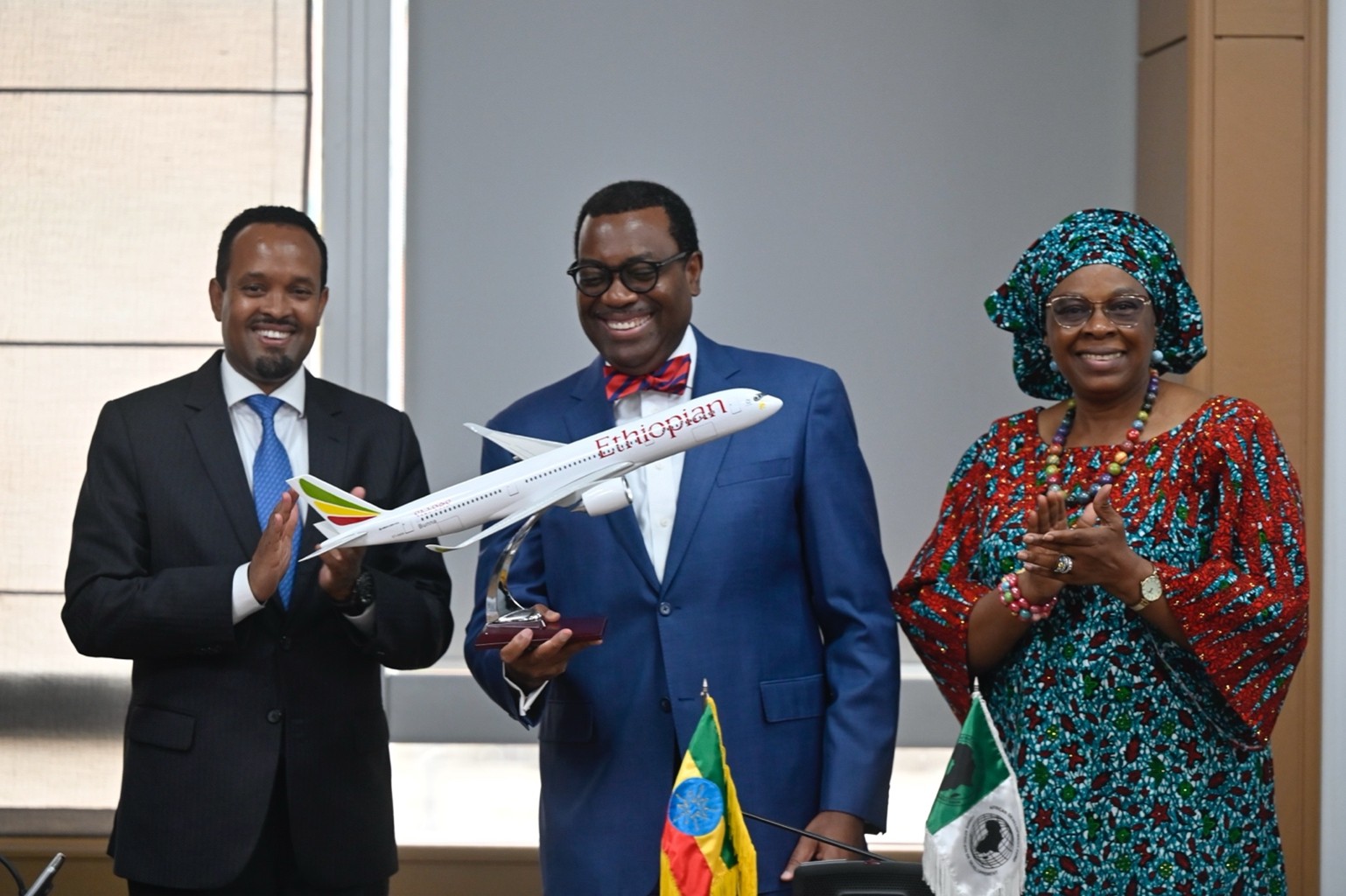 Ethiopian Airlines Group CFO Mensfin Tasew (left) and AfDB Vice President Nnenna Nwabufo display copies of the signed letter of intent. Standing behind them are Ethiopia’s Finance Minister Ahmed Shide (left) and Bank Group President Dr. Akinwumi Adesina (in bow tie)