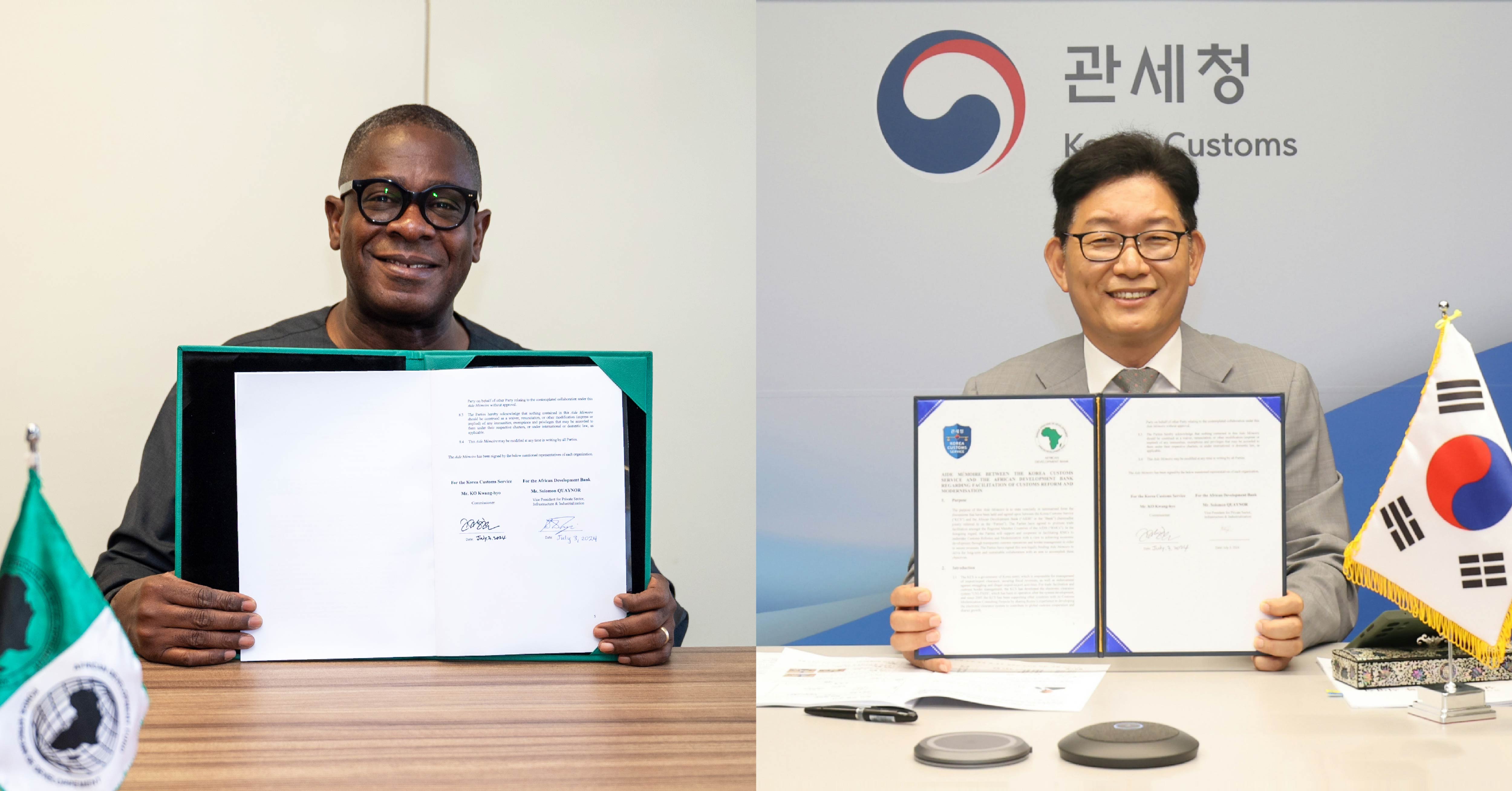 Le vice-président de la BAD, Solomon Quaynor (à gauche), et le commissaire Ko Kwang-hyo du service des douanes coréen ont signé un aide-mémoire pour collaborer à la facilitation du commerce intra-africain