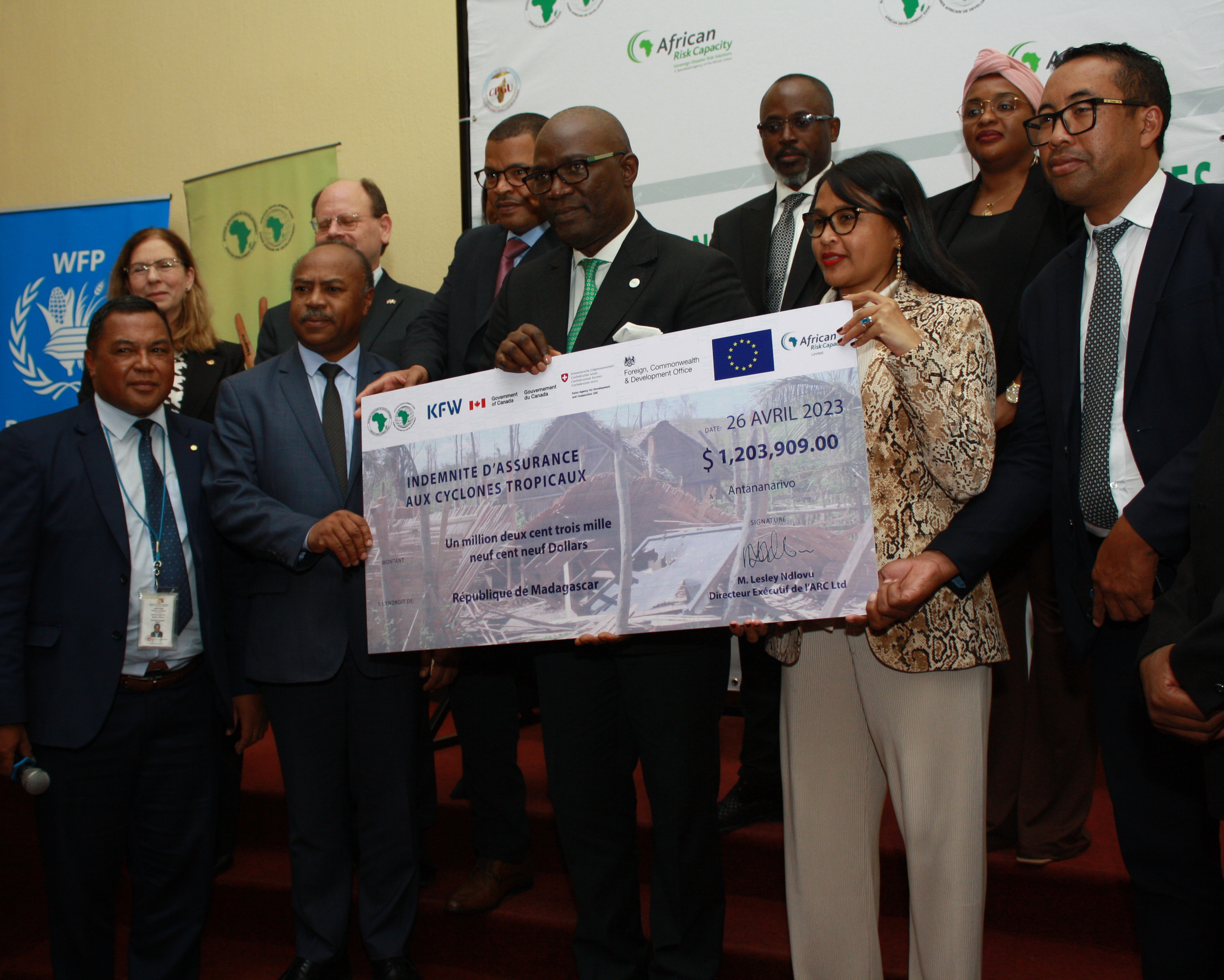 From left: Mamy Razakanaivo, Executive Secretary of the CPGU; World Food Program Madagascar Country Director Pasqualina Di Sirio; Madagascar Minister of Agriculture and Livestock Harifidy Ramilison; UK Ambassador to Madagascar David Ashley; AfDB Madagascar Country Manager Ada Amoumoun; UN Assistant Secretary General and ARC Group Director General Ibrahima Cheikh Diong; ARC Ltd Head of Government Services for East and Southern Africa Koffi Konin; Madagascar Minister of Economy and Finance Rindra Hasimbelo Rabarinirinarison; AfDB Programme Officer Fatoumata Camara; and General Secretary of the Malagasy Government Indriamanga Rakotoarisoa at the handover ceremony.