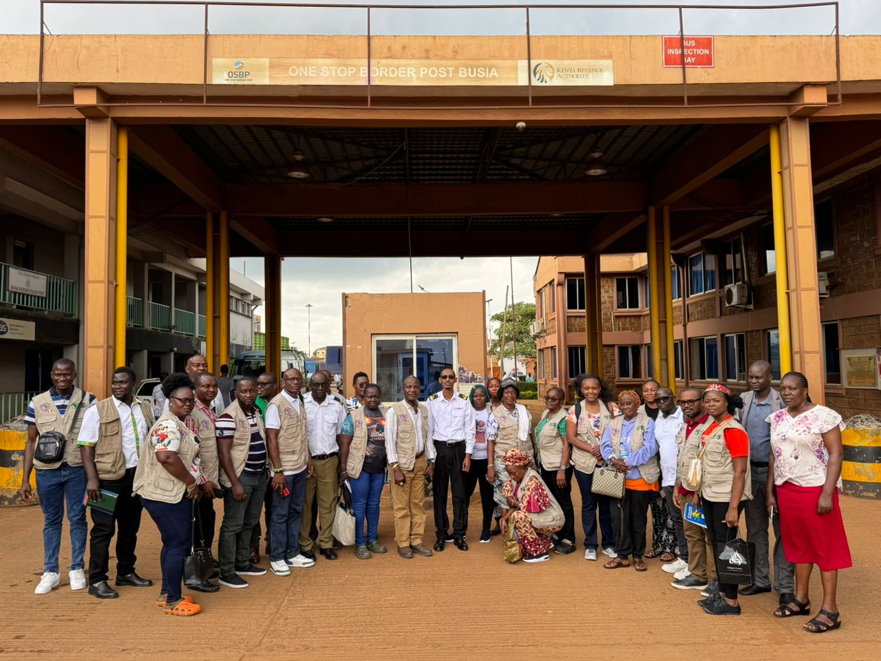 A delegation of the study tour, comprising women traders and border officials from Liberia and Sierra Leone, as well as representatives from the African Development Bank at the One-Sto- Border-Post in Busia