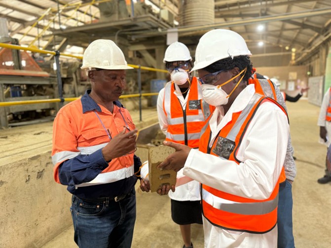 AfDB’s Deputy Director General for Southern Africa, Moono Mupotola inspects freshly manufactured bricks at the revitalized Lobatse Clay Works facility during her recent site visit to the project