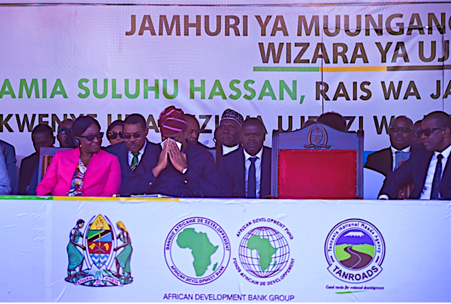 President of Tanzania, Samia Suluhu Hassan addresses the community during a tour of Bank-funded transport projects in Dodoma with Bank Group President, Dr. Akinwumi Adesina, with his wife Grace Adesina, on 14 June 2025