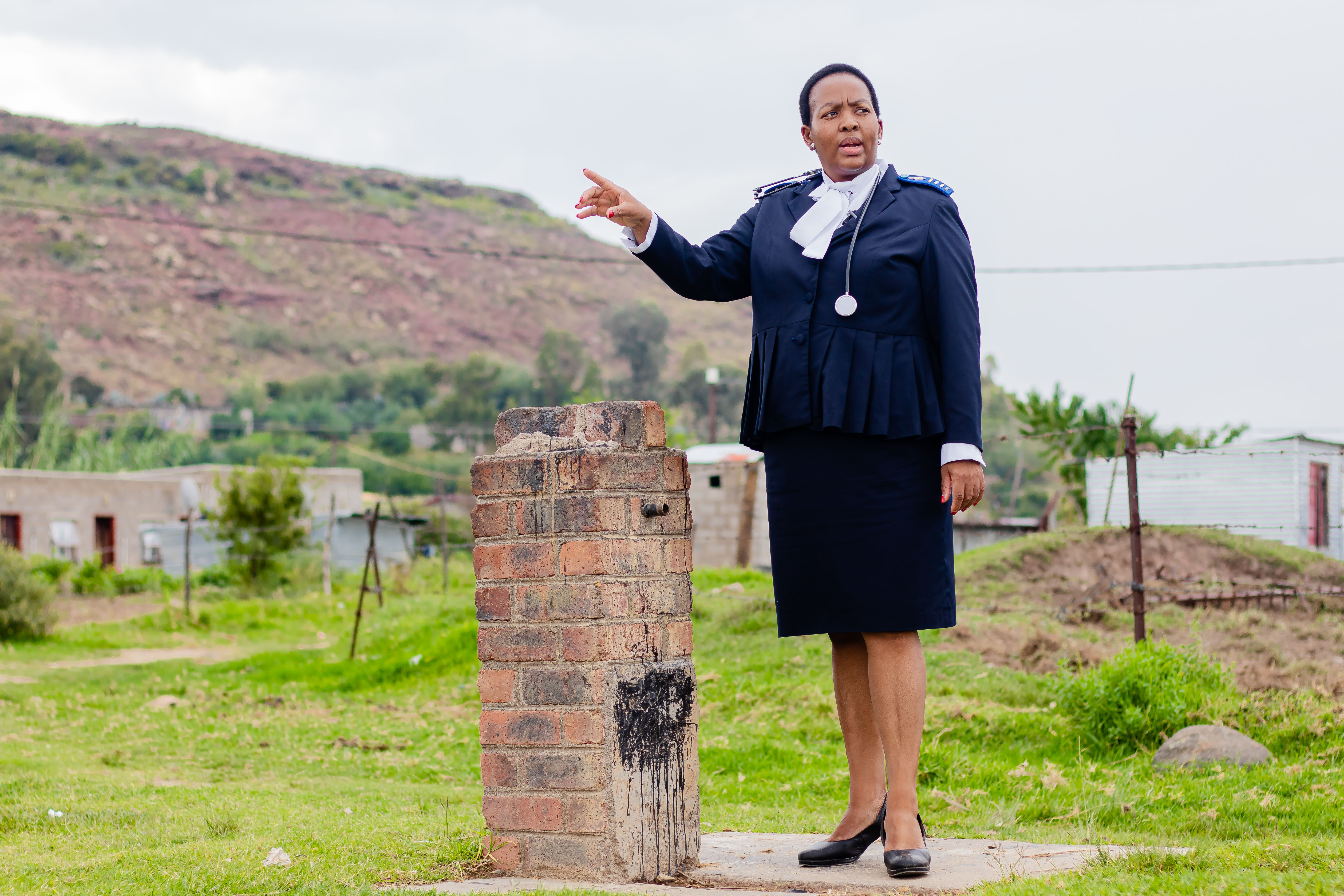 Community nurse Mots'elisi Makhele stands by the tap that previously served around 2,000 people and indicates the houses now connected to modern facilities constructed through the Lesotho Rural Water Supply and Sanitation Project