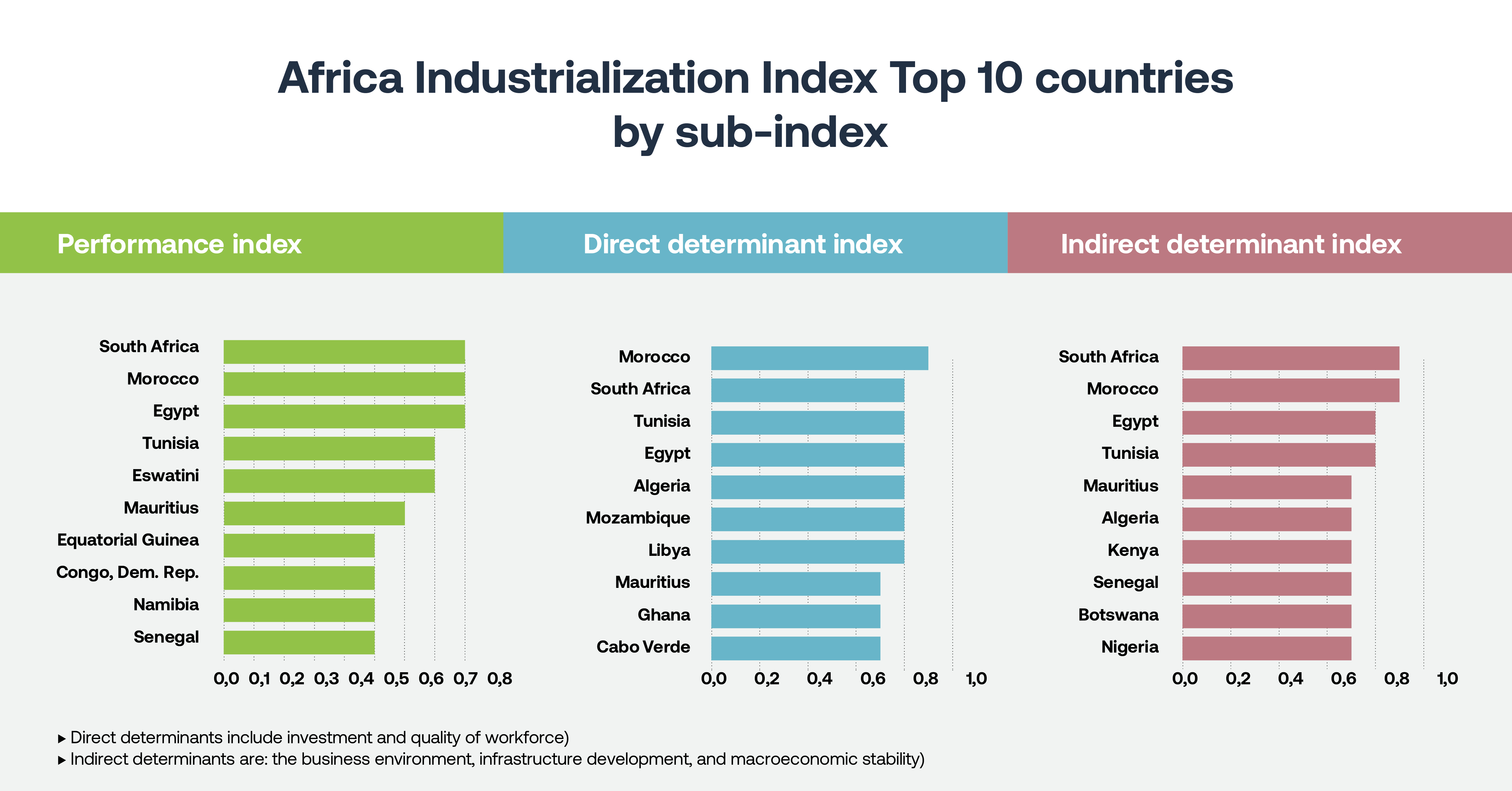 Les 19 indicateurs de l’indice couvrent les performances manufacturières, le capital, la main-d’œuvre, l’environnement des affaires, les infrastructures et la stabilité macroéconomique. L’indice établit également un classement du niveau d’industrialisation des pays africains selon trois axes : les performances, les déterminants directs et indirects. Les déterminants directs comprennent les dotations en capital et en main-d’œuvre et la manière dont elles sont déployées pour stimuler le développement industriel. Les déterminants indirects comprennent les conditions environnementales favorables telles que la stabilité macroéconomique, des institutions et des infrastructures solides.