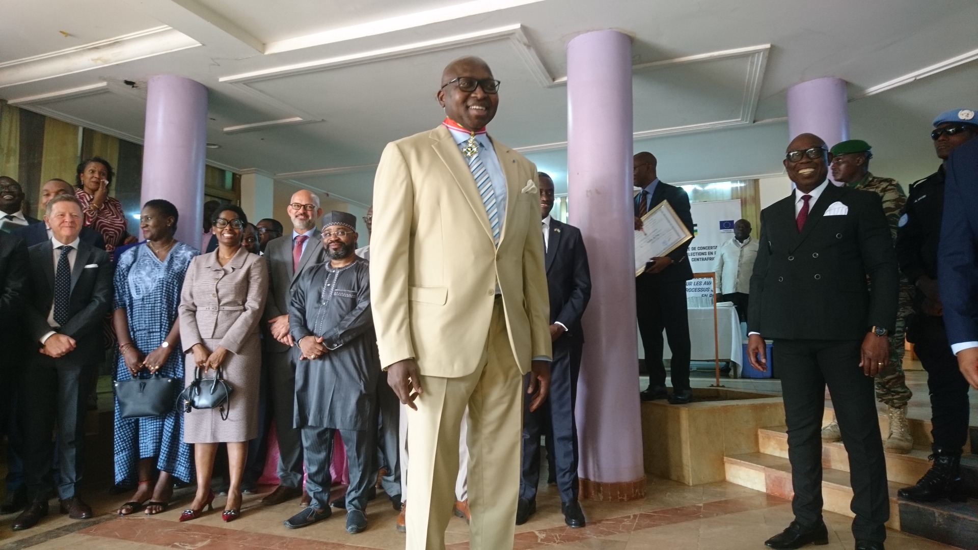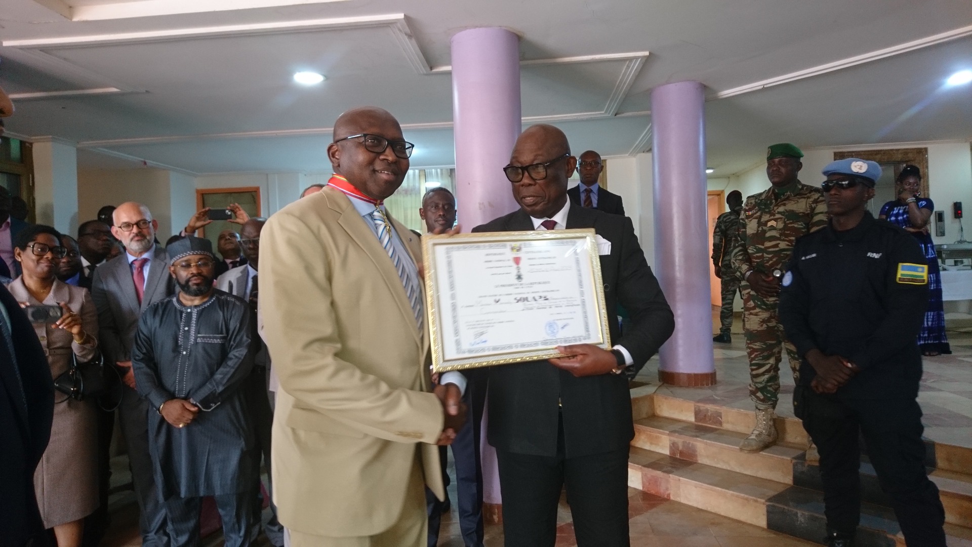 - Le Premier ministre centrafricain, Félix Moloua, remet à Mamady Souaré, représentant pays du Groupe de la Banque africaine de développement, la distinction de Commandeur dans l’Ordre du Mérite centrafricain, en hommage à son action pour la reconstruction et le développement du pays